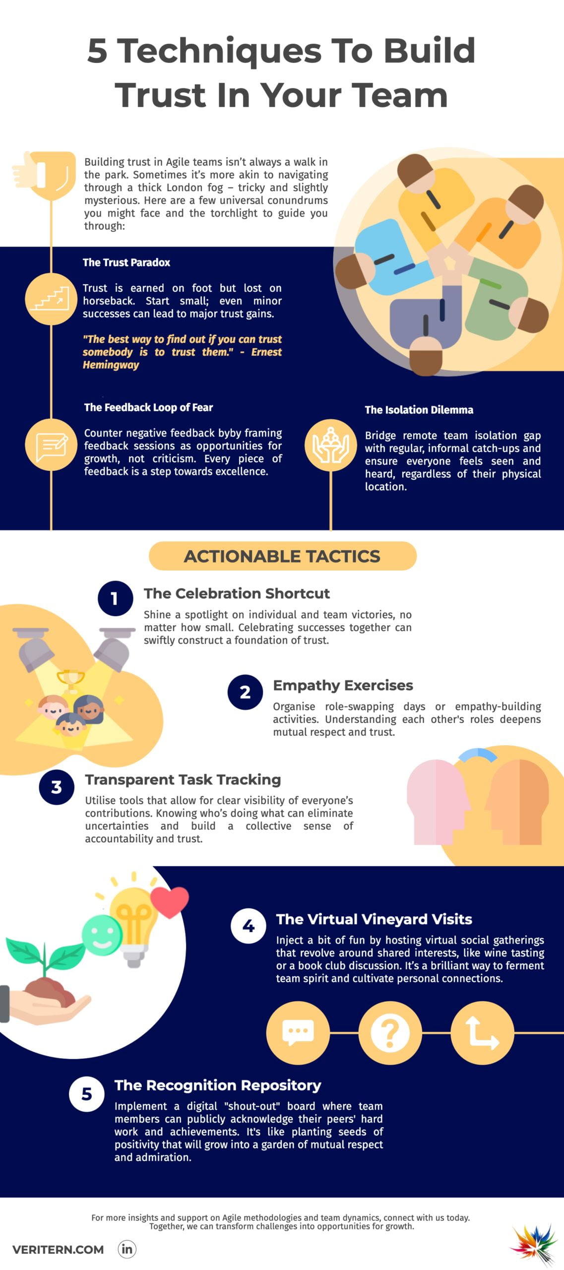 Start with the fact that trust, much like a well-brewed cup of tea, takes time to steep. Imagine beginning your day in the bustling streets of your town, where every small interaction – a smile, a polite nod, a brief exchange – lays down the cobblestones of trust. Similarly, in Agile teams, it’s the little victories and the seemingly minute acknowledgements that build a towering fortress of trust.