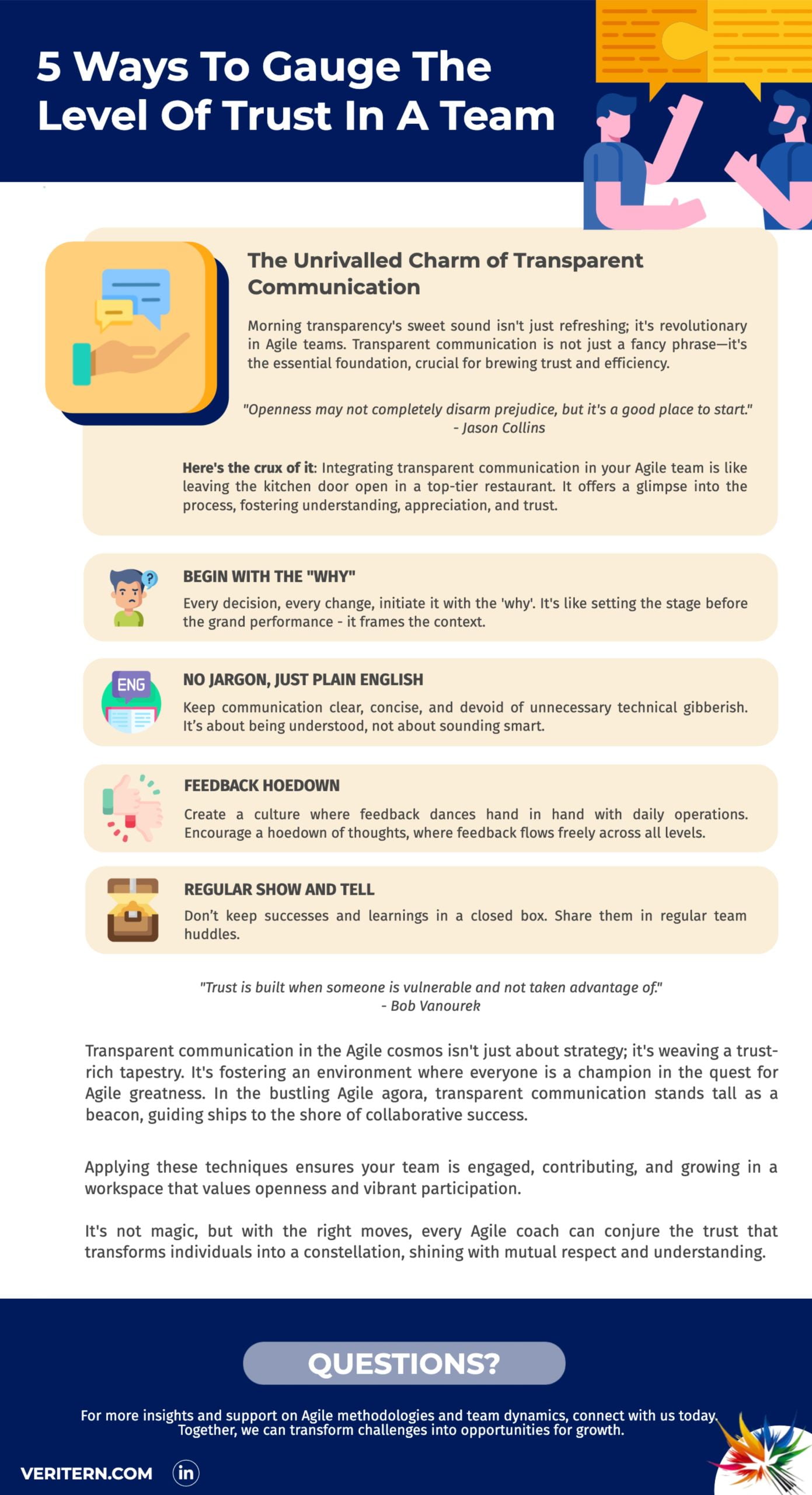 Ah, the sweet aroma of trust within a team – it’s not something you can bottle up and spray around whenever the atmosphere gets tense. Yet, it’s the invisible glue holding the very essence of a successful Agile team together. Imagine starting each day knowing exactly where you stand, having the freedom to express ideas without the fear of being misunderstood, and dancing in harmony with feedback – sounds idyllic, doesn’t it? 😊 Well, buckle up, as we’re about to take a joyride through the heart of transparent communication, without spilling the beans on the detailed how-tos that await below in our nifty infographic.