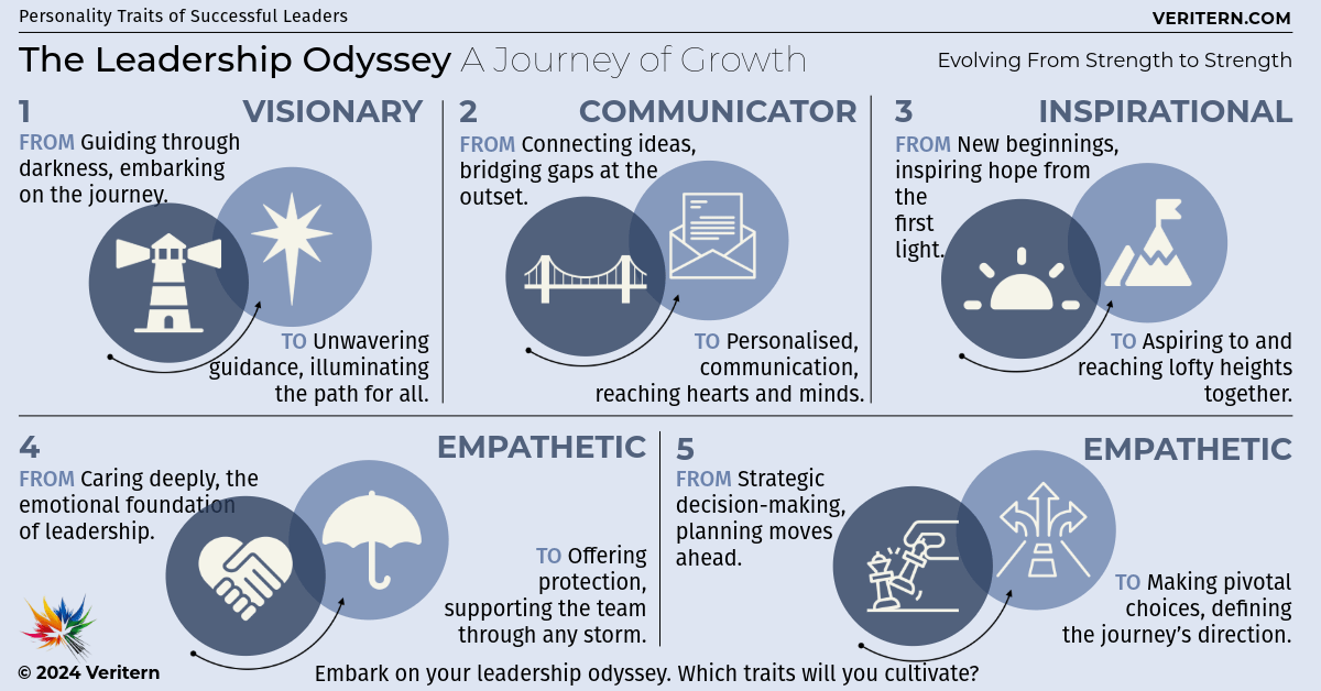 Our infographic, “The Leadership Odyssey: Cultivating Leadership Traits”, serves as a visual guide, illustrating the evolutionary path of quintessential leadership qualities. It starts with the foundational quality of vision—represented first by a lighthouse and evolving into the North Star, symbolising the growth from local to universal insight. Communication is next, transforming from the bridge of initial connections to the letter of personal, impactful messaging.